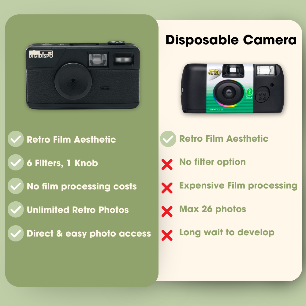 Unlike disposable cameras, DigiDispo combines nostalgic vibe with digital convenience. You can easily transfer your photos directly to your phone/computer, so no waiting for film to develop!